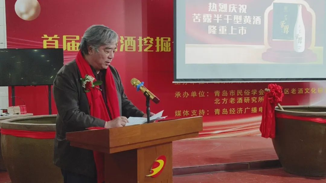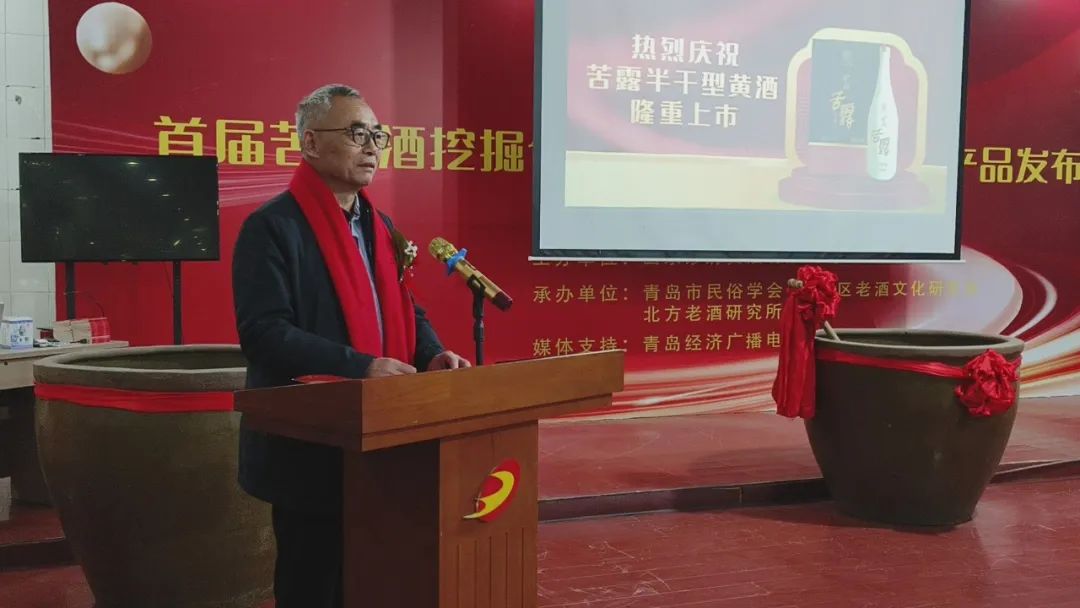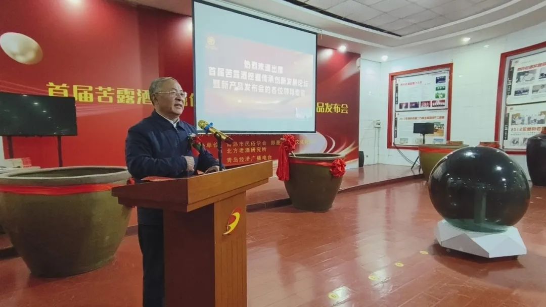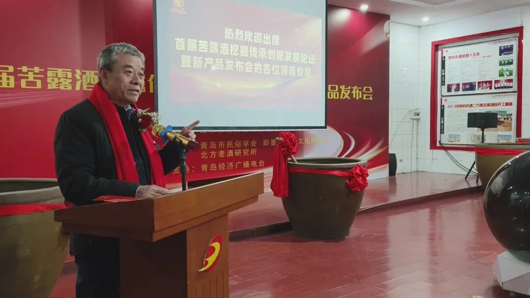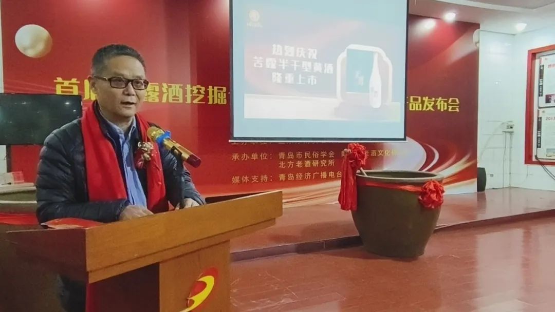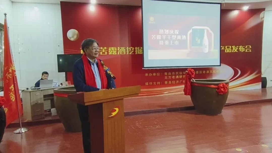 中国酿酒大师致辞中国酿酒大师、青岛市即墨黄酒工程技术中心首席专家、全国五一劳动奖章获得者、即墨黄酒传统酿造工艺代表性承传人于秦峰介绍,苦露是以流传了三千多年工艺标准——“古遗六法”生产的即墨传统老酒,“与传统即墨黄酒相比,苦露为半干型、干型的老酒,保留了即墨黄酒微苦余香的口感,含糖量是原来传统老酒的六分之一。”