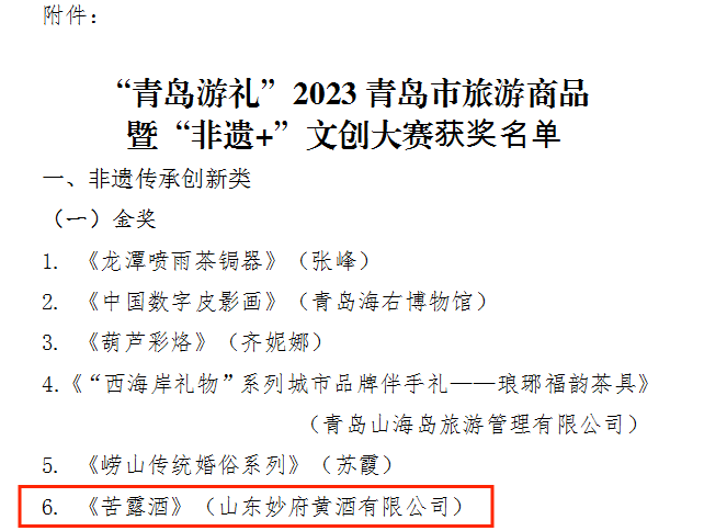 由青岛市文化和旅游局、青岛市广播电视台、青岛开放大学主办,青岛市非物质文化遗产保护中心、青岛市广播电视台文创中心、青岛市社区教育指导服务中心承办的“青岛游礼”2023青岛市旅游商品暨“非遗+”文创大赛已圆满结束。经大赛组委会组织评审,《苦露酒》(山东妙府黄酒有限公司)等17件作品获得金奖,《锔瓷镶嵌礼品杯》(周华)等34件作品获得银奖,《布艺系列》(王磊)等51个作品获得铜奖,《我在青岛,奔赴一场山海系列伴手礼》(王之林)等5个作品获得网络人气奖。