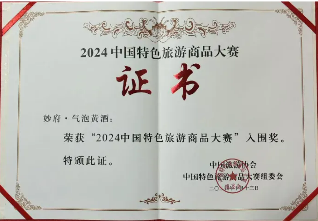 这次能够在众多优秀的旅游商品中脱颖而出,入围 “2024 中国特色旅游商品大赛”,是对妙府努力的极大肯定和鼓励。这不仅证明了妙府气泡黄酒的独特魅力和卓越品质,也彰显了妙府在黄酒创新领域的领先地位。
