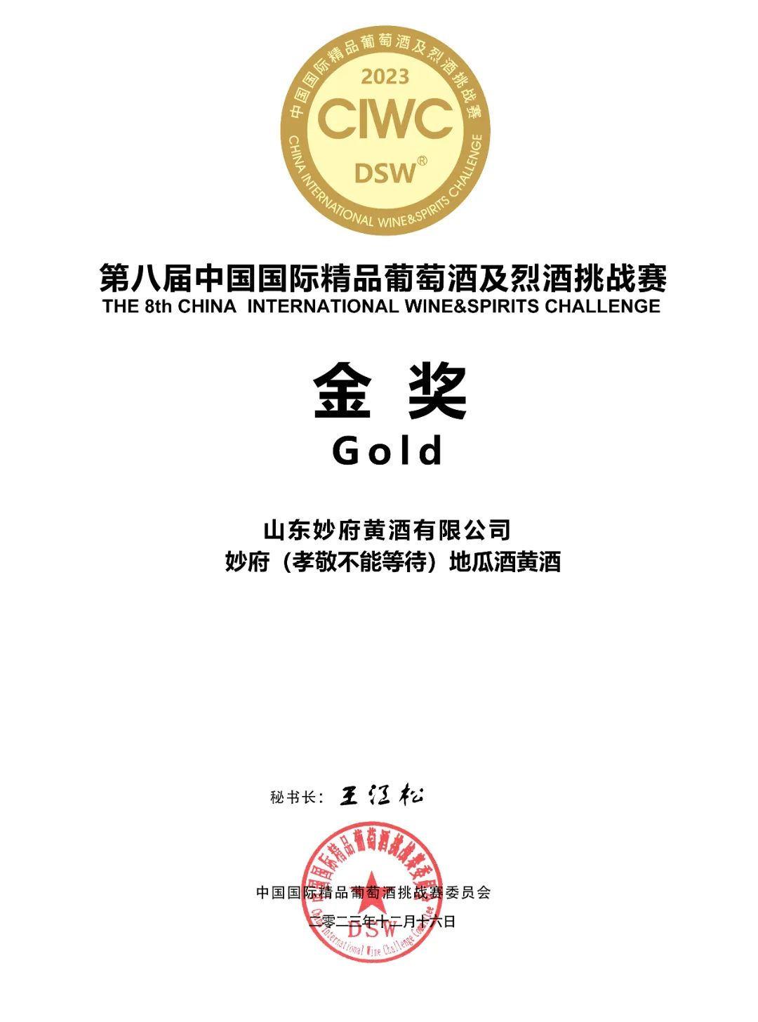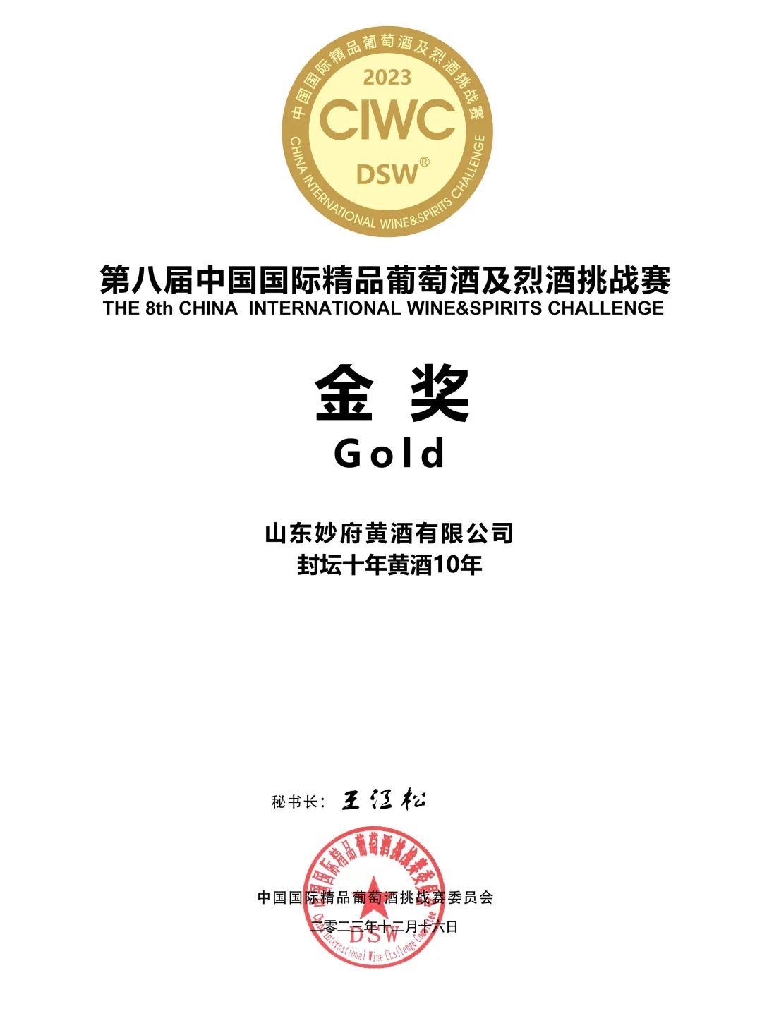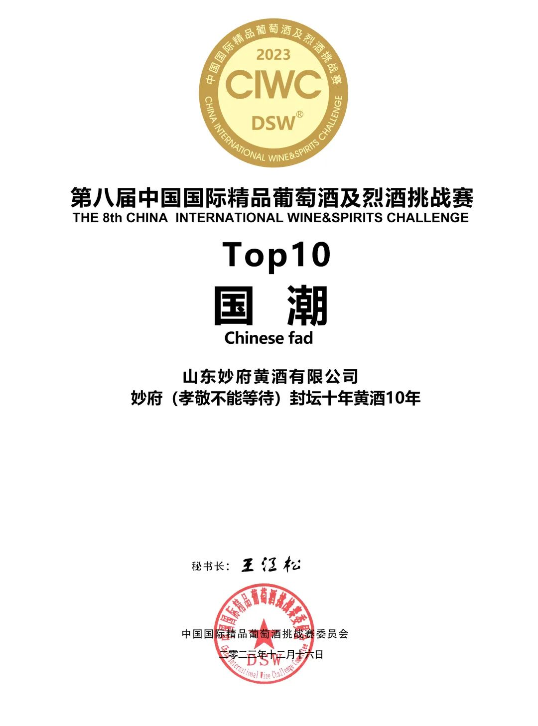 2023年12月16日,由中国国际精品葡萄酒及烈酒组委会(简称DSW)主办第八届中国国际精品葡萄酒及烈酒挑战赛(简称CIWC)在青岛举办,有来自全国20多位评委的盲品下,评出了干白组、干红、水果、蒸馏酒、加强型酒、威士忌等组别奖项,其中还盲品出了霞多丽、赤霞珠、马瑟兰、甜酒以及国产品种top10以及中国清酒、中国黄酒。妙府鲜地瓜酒、自加热黄酒、封坛十年黄酒荣获“金奖”,妙府封坛十年黄酒荣获“国潮”奖。