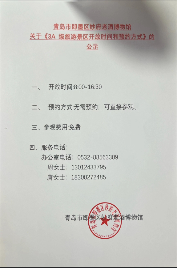 青岛市即墨区妙府老酒博物馆 关于《3A 级旅游景区开放时间和预约方式》的公示